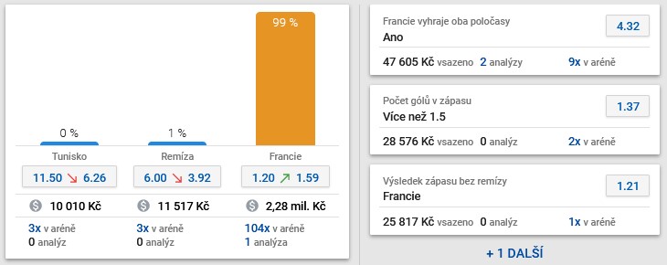 Tunisko proti proti Austrálii nehrálo dle představ a proto mu proti Francii takřka nikdo nevěří. Kurz 1,59 je lákavý, na tuto událost se vsadilo již 2,26 milionu korun. Avšak pozor na to, že mají Francouzi jistý postup.