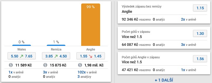 92 tisíc korun je vsazeno na výhru Anglie bez remízy v kurzu 1,15, mírně odvážnější může být sázka na více než 1,5 gólu v zápase v kurzu 1,3, na tuto událost se vsadilo 62 tisíc. Nutno ovšem dodat, že do utkání zbývá velké množství hodin a peníze budou jen přibývat.