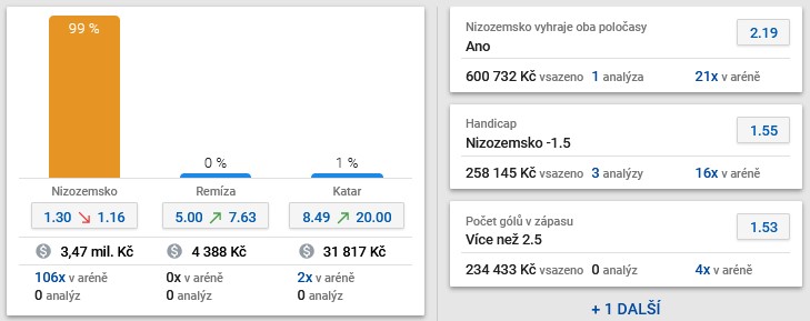 I zde je několik dalších zajímavých příležitostí. Na to, že Nizozemsko vyhraje oba poločasy v kurzu 2,19 je vsazeno již 600 tisíc korun, na handicap -1.5 Nizozemska v kurzu 1,55 takřka 250 tisíc.