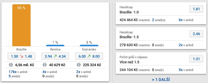 Ti věří Brazílii i v handicapech. Na handicap -1.0 v kurzu 1,81 je vsazeno 422 tisíc korun, na -1.5 v kurzu 2,46 takřka 300 tisíc! 200 000 korun se vsadilo i na Brazílii ve výsledku bez remízy v kurzu 1,15.