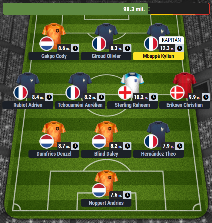 Do obrany jsem zvolil trojici krajních obránců, dva z Nizozemska, jednoho z Francie. Denzel Dumfries i Daley Blind získali v prvních dvou kolech shodně 7 bodů. Tuto dvojici doplní levý bek Francie Theo Hernandez.