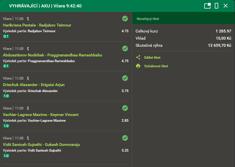 Šachy nepatří mezi nejpopulárnější sporty. Dokonce je mnozí za sport ani nepovažují, avšak jeden šťastlivec je musí mít pořádně rád. Ve středu si totiž vsadit na pět zápasů s vyšším kurzem a poté se mohl radovat.